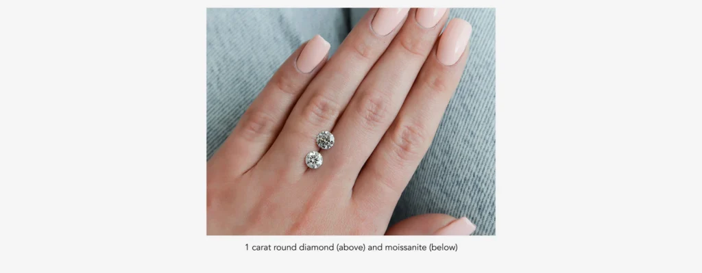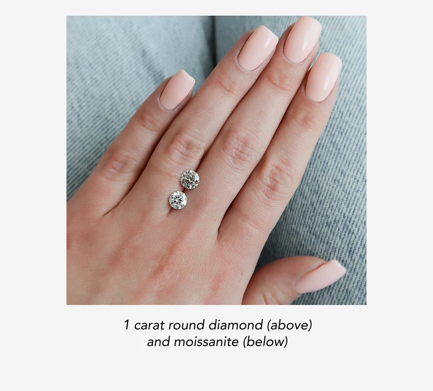 It is important to note that carat weight does not necessarily denote size. Different gemstones have different densities, moissanite stones are about 15 – 18% lighter than diamonds. Therefore, while a 6.5mm round diamond weighs 1.0 carat, a 6.5mm moissanite weighs 0.83 – 0.85 carats. However, the two stones would be the same actual size: 6.5mm in diameter.Factors like shape, cut, and depth also affect how large a gemstone looks. Keep in mind that every gemstone is unique, so carat weight can appear differently depending on the stone.