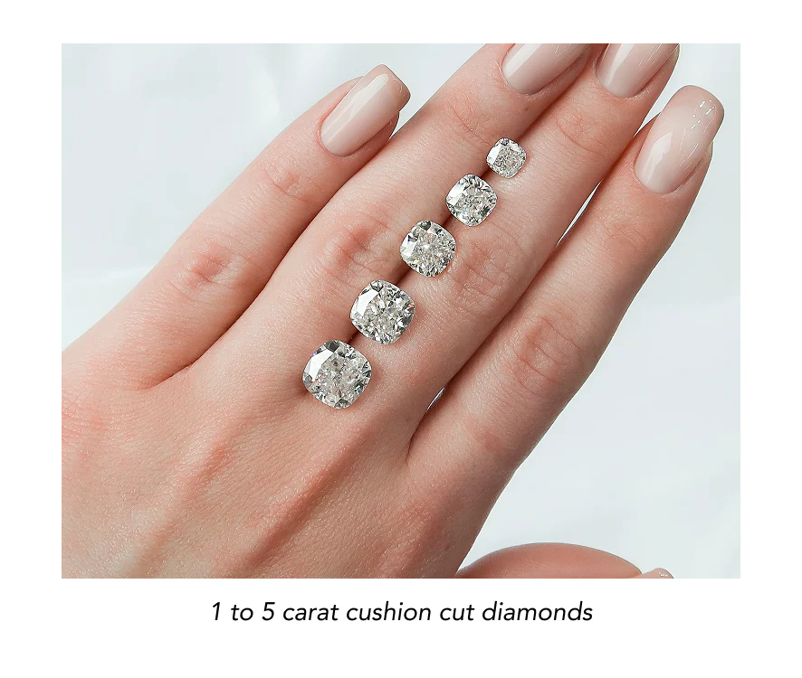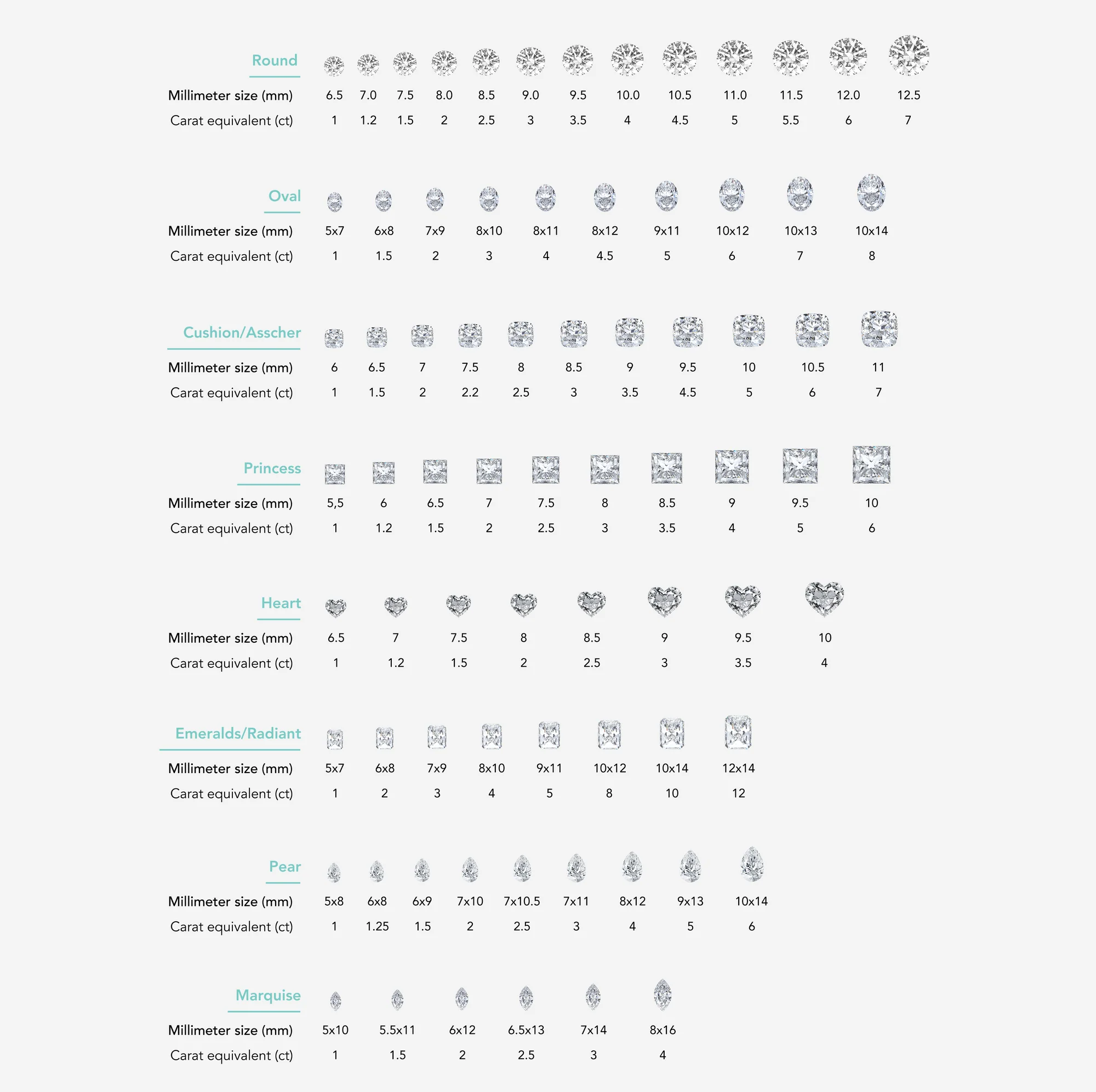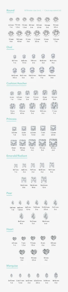 This chart provides an estimate of the average size of different diamond shapes at various carat weights. Each image represents a top-down view of the diamond.