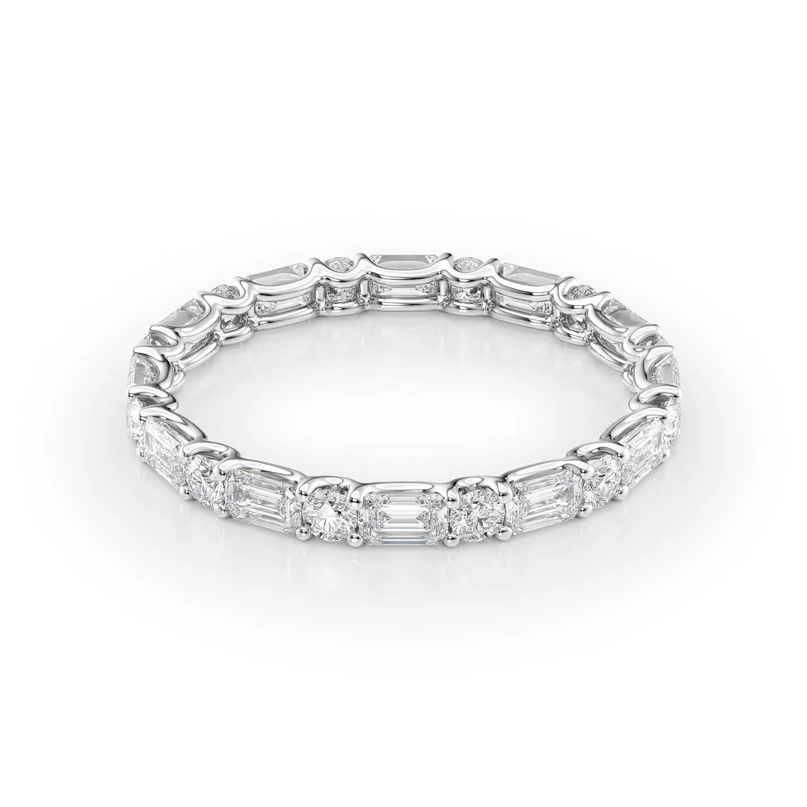 Discover the ultimate symbol of elegance and timeless beauty with the Alternating Emerald and Round U Prong Eternity Ring. This exquisite piece masterfully combines emerald-cut diamonds set in a distinctive east-west orientation with round brilliant-cut diamonds nestled in dainty U prongs. Each diamond is selected for its brilliance and clarity, creating a harmonious balance of shapes that dance in the light.