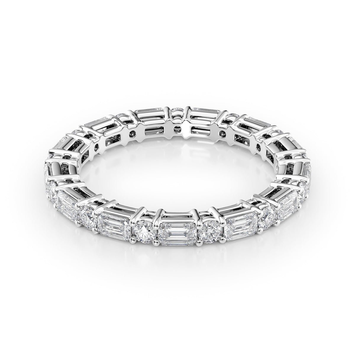 Indulge in the unparalleled elegance of the Alternating Emerald and Round Basket Eternity Ring, a masterpiece that seamlessly combines the regal allure of emerald-cut diamonds in an east-west orientation with the radiant sparkle of round brilliant-cut diamonds in a classic basket setting. This ring is a celebration of love’s eternal journey, offering a luxurious blend of sophistication and brilliance that promises to captivate and enchant.