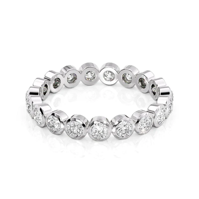 Introducing the timeless and luxurious Round Bezel Eternity. The bezel setting and round cut diamonds are a fiery and opulent combination guaranteed to deliver maximum sparkle and brilliance. Whether as an anniversary or wedding band, this eternity ring will take your breath away with its timeless beauty and undeniable glamor. Treat yourself or someone special to the ultimate symbol of love and luxury with the Round Bezel Eternity.