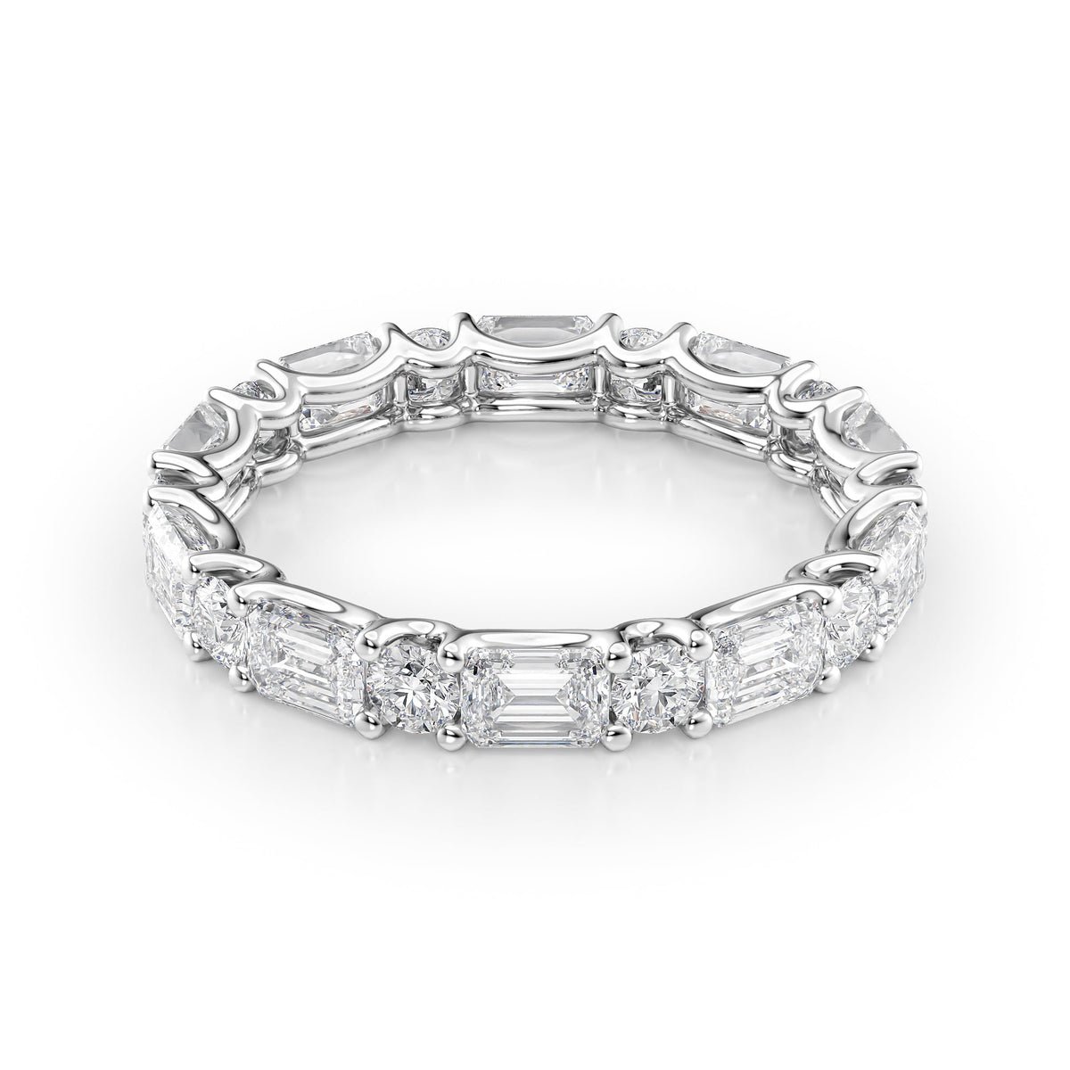 Discover the ultimate symbol of elegance and timeless beauty with the Alternating Emerald and Round U Prong Eternity Ring. This exquisite piece masterfully combines emerald-cut diamonds set in a distinctive east-west orientation with round brilliant-cut diamonds nestled in dainty U prongs. Each diamond is selected for its brilliance and clarity, creating a harmonious balance of shapes that dance in the light.