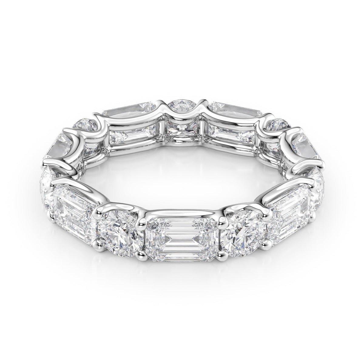 Discover the ultimate symbol of elegance and timeless beauty with the Alternating Emerald and Round U Prong Eternity Ring. This exquisite piece masterfully combines emerald-cut diamonds set in a distinctive east-west orientation with round brilliant-cut diamonds nestled in dainty U prongs. Each diamond is selected for its brilliance and clarity, creating a harmonious balance of shapes that dance in the light.
