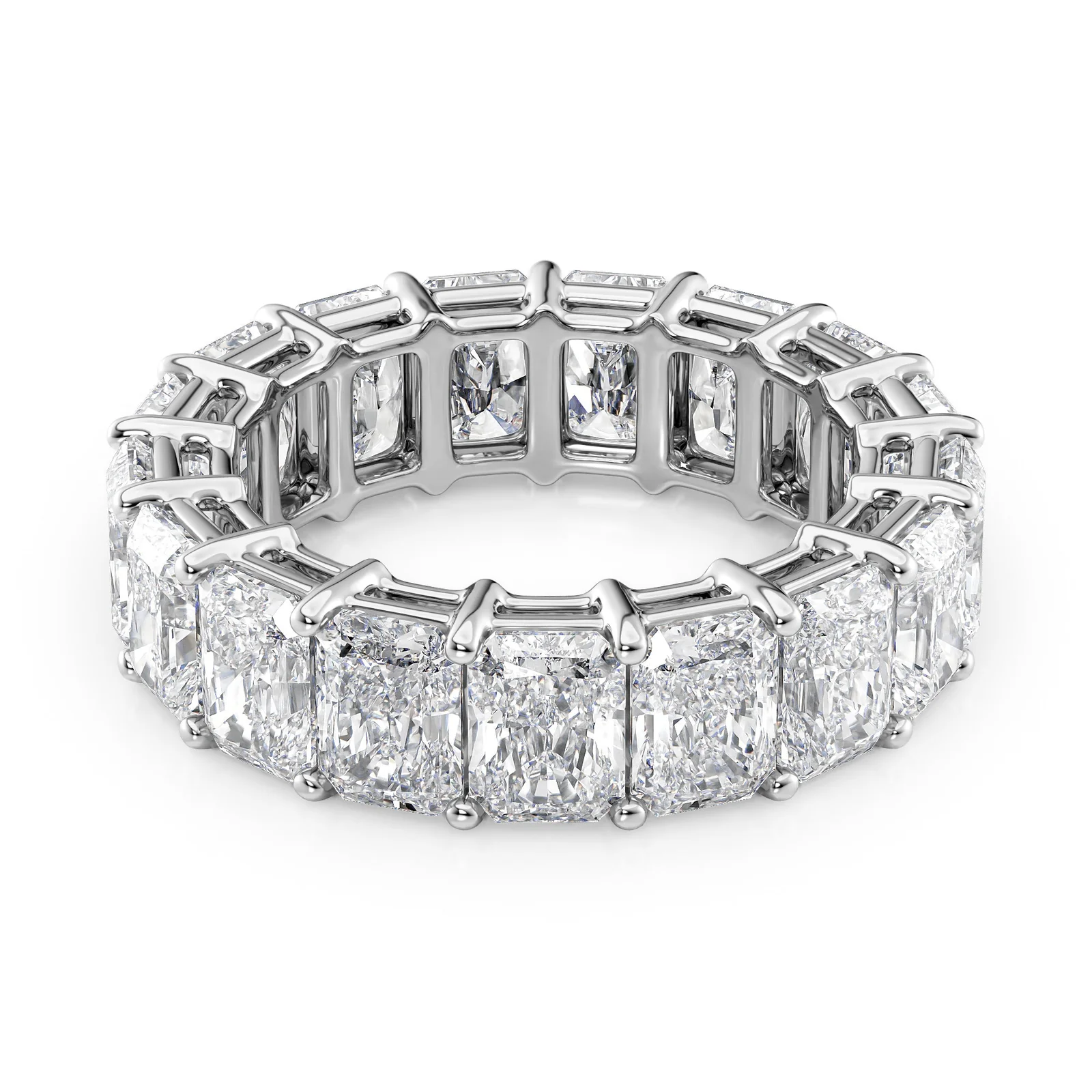 The Radiant Eternity Ring shines with its continuous circle of exquisite radiant-cut diamonds, offering a modern yet timeless symbol of everlasting love. This captivating piece is designed to highlight the unique brilliance of each diamond, creating an endless band of light that wraps elegantly around the finger. Perfect for those who appreciate the blend of contemporary design and classic elegance.