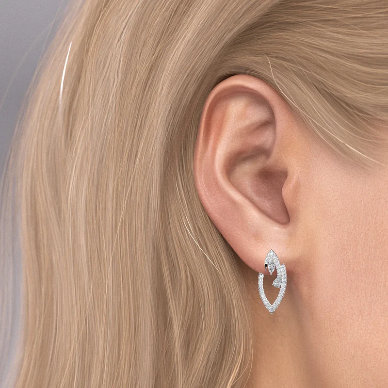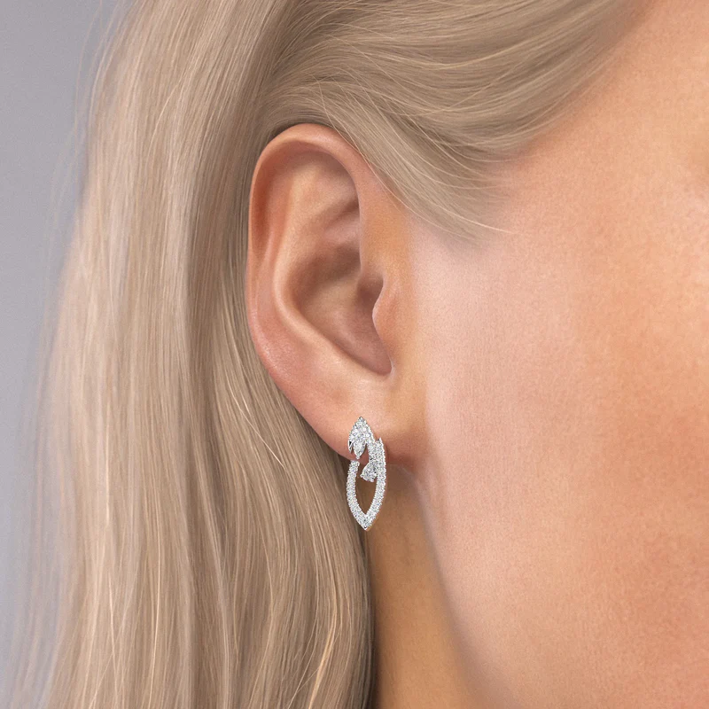 Grace your ears with a touch of unparalleled elegance: the Diamond Marquise Earrings. The distinct marquise shape, with its elongated design, radiates brilliance and elevates your overall look. The pave-set diamonds have a collective sparkle reminiscent of a starlit night, but the true stars are the accent stones: a single pear cut and marquise cut diamond on each earring. These diamonds, chosen for their perfect clarity and shimmer, interplay with the light, ensuring an ethereal radiance with every turn of your head.