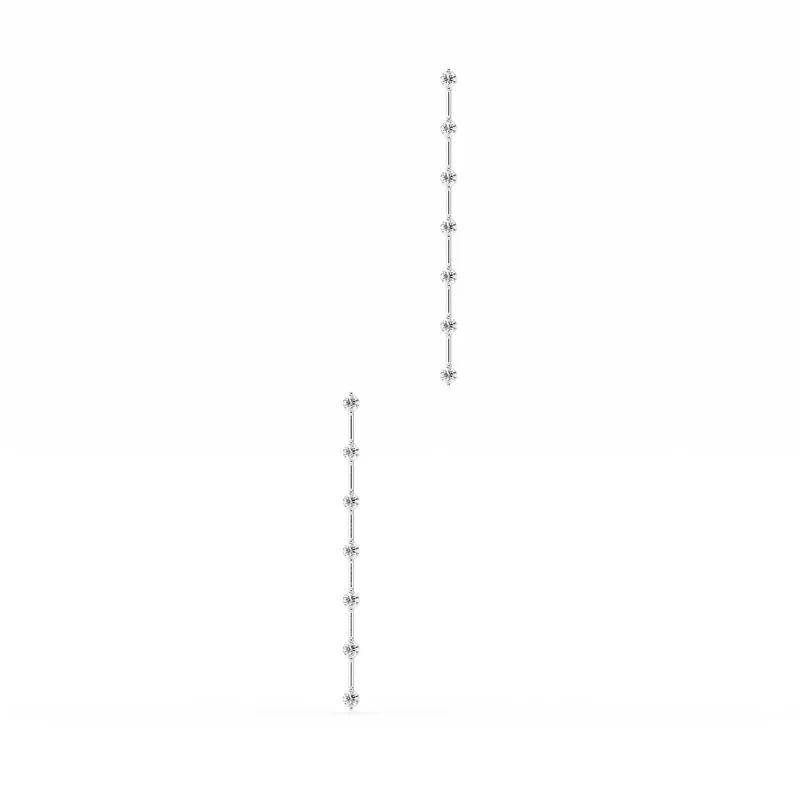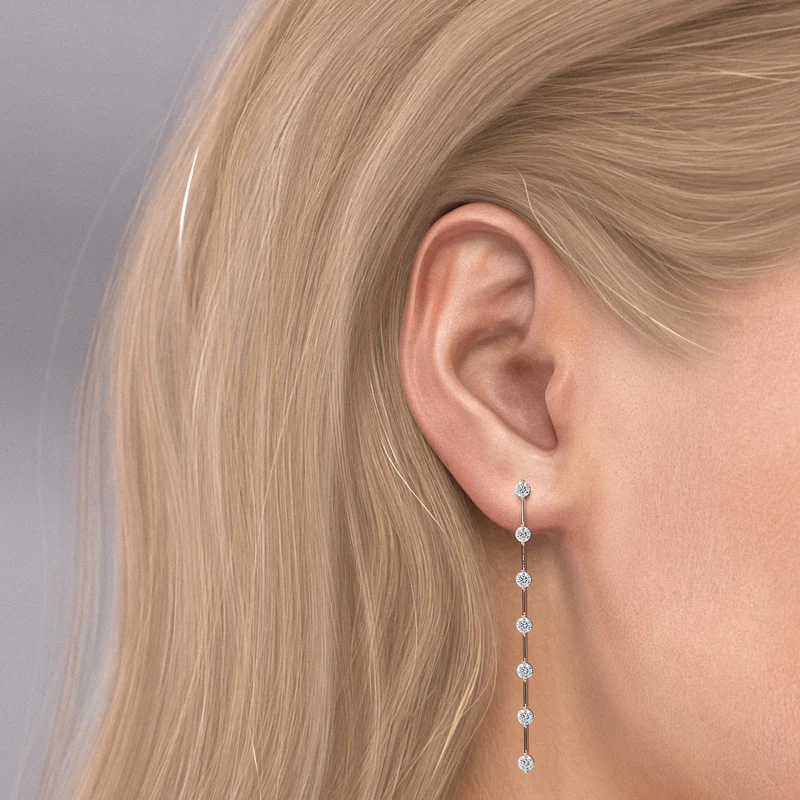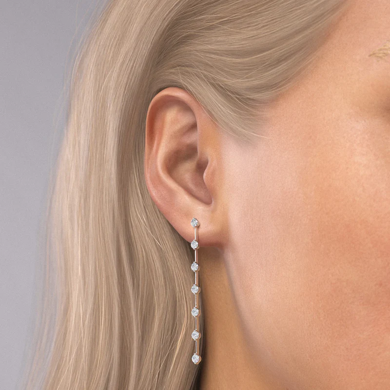 These exquisite Distance Dangle Earrings feature seven sparkling diamonds arranged in a beautiful linear pattern, creating a stunning visual effect that shimmers and sparkles with every move. Each diamond is expertly set in a sleek and modern dangle design that accentuates the beauty of the stones. Whether you’re treating yourself or someone special, these earrings are sure to impress with their timeless beauty and effortless style.