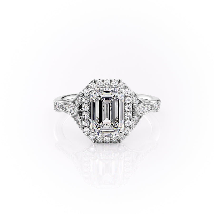 The Halo Stephanie Set With A 1.0 Carat Emerald 14K White Gold Lab Diamond